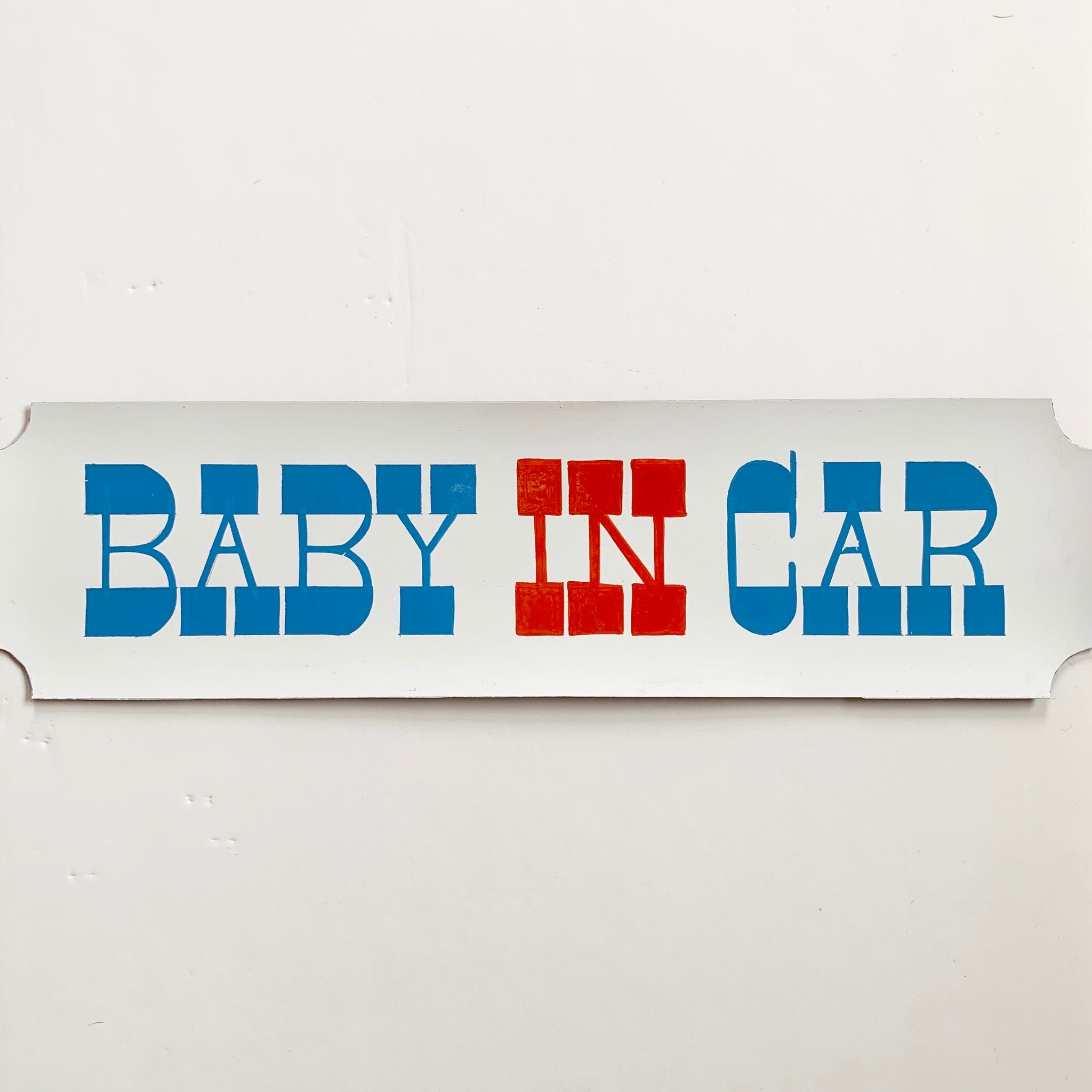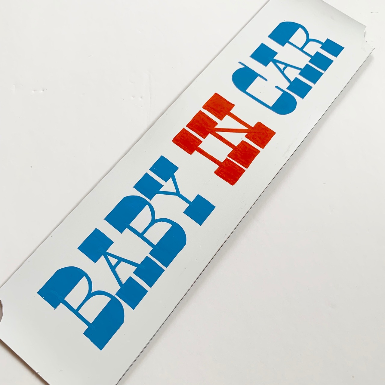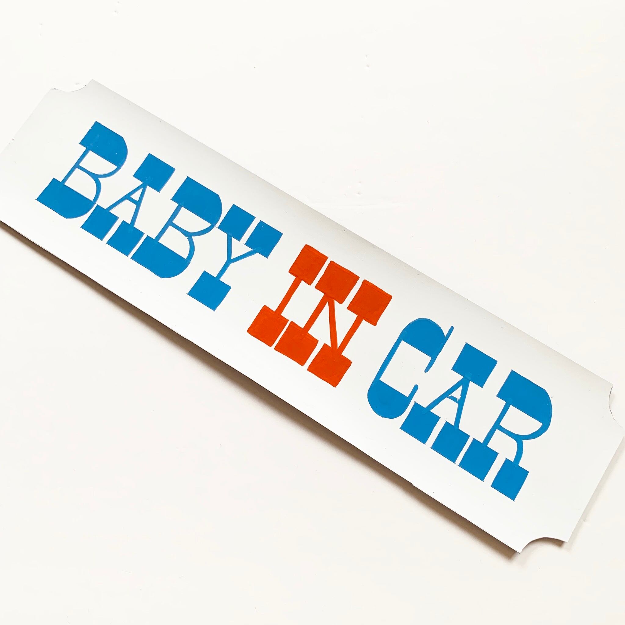 "baby in car" とサインペイントしたマグネットシートです。